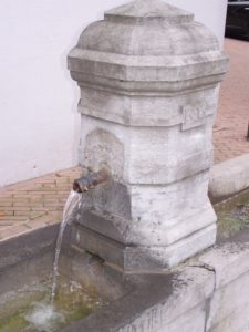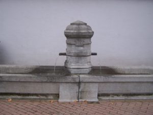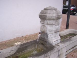 Á l'angle de deux rues, la petite fontaine alimente des bassins opposés. Le fût octogonal est scandé d'anneaux. Une calotte coiffe le tout. La répartition symétrique des bacs en pierre de taille lui confère une élégance malheureusement amoindrie par son cadre. La date millésime de 1895 est gravée sur l'une des faces du fût.